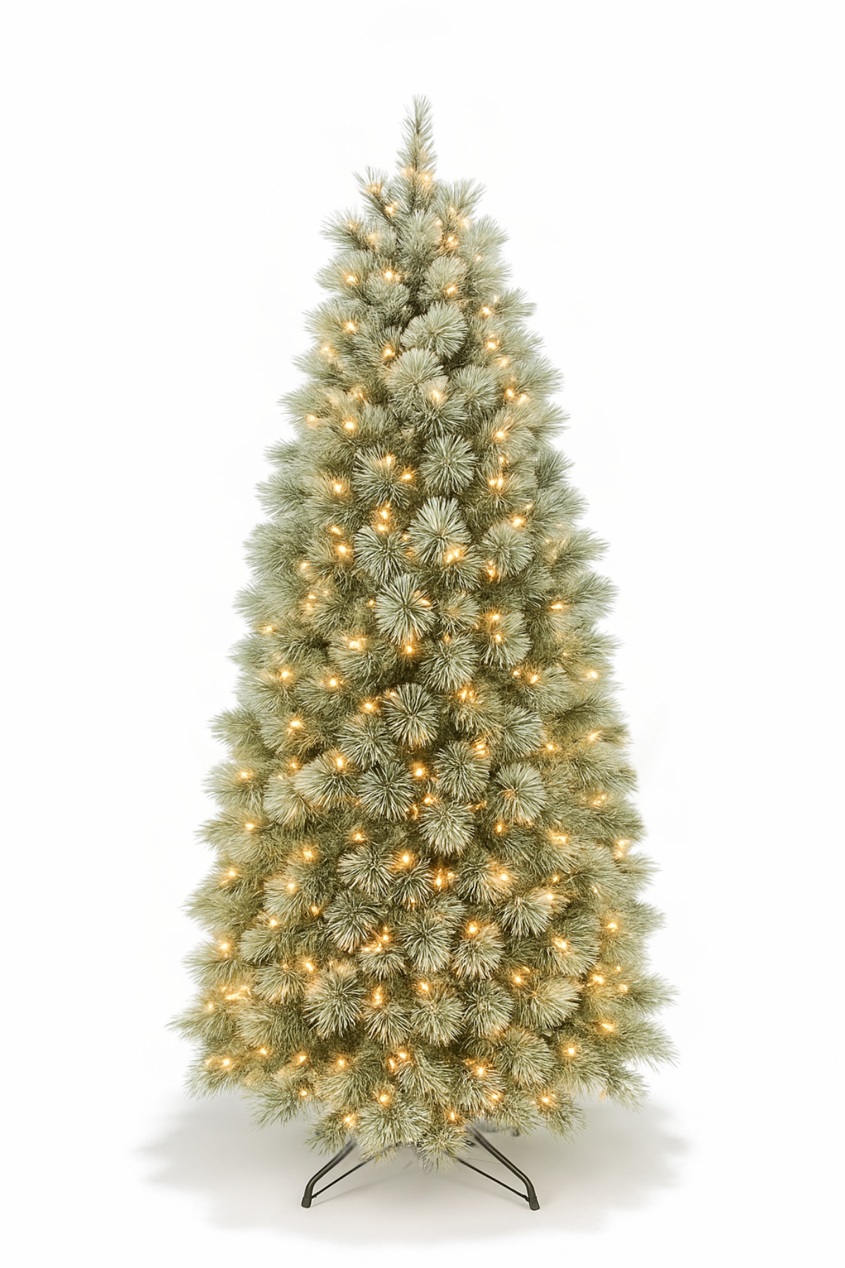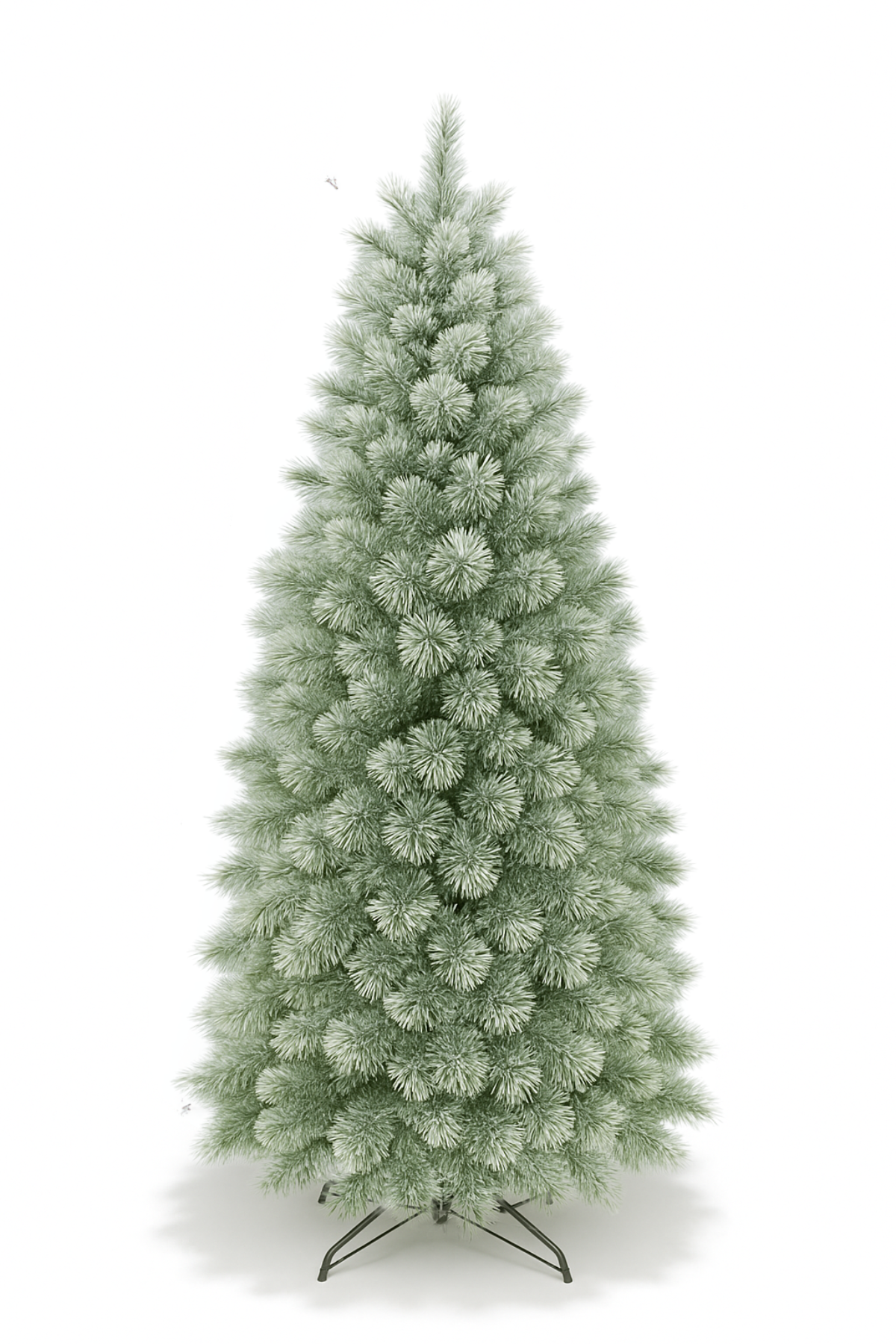 A uniquely designed slim Christmas tree with soft, fluffy, cashmere-like tips that appear white on each branch. We combine hard and soft blue-green pine needles with smaller new growth arrow tips on each branch to create a plush, full, and spectacular tree that evokes the beauty of European and American winters.